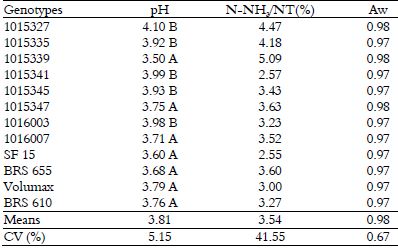 With respect to the quality of the produced silage, genotypes did not differ as to the water activity and ammonia nitrogen. However, for the pH values, there were differences between the genotypes (p < 0.05) (Table 2).