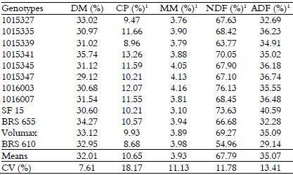 There was no difference (p > 0.05) in the content of mineral matter (MM), neutral detergent fiber (NDF), acid detergent fiber (ADF) between the genotypes. Values of mineral matter ranged from 3.1 to 4.2%, being similar for all genotypes tested. Ash content determines the amount of minerals in the forage, but high levels can represent high silica content, which has no nutritional contribution to animals. Generally, animal foods are rich in calcium and phosphorus; plant foods have low value of mineral matter and variable minerals.