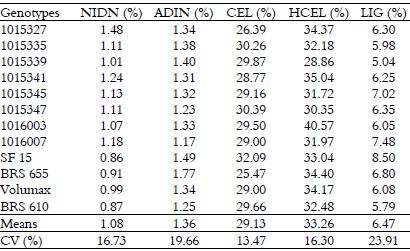 Mean values for the 12 genotypes evaluated for NDF and ADF were 67.8 and 35.1%, respectively. NDF analysis is very important for determining the nutritional value of the forage, because this fiber fraction is negatively correlated with intake. Von Pinho et al. (2007) observed values for NDF (42.9%) and ADF (26.6%) for dual-purpose sorghum lower than those found in this experiment. Despite the NDF and ADF fractions are above recommended, the composition of these fractions are more important than the level per se, and it is necessary to evaluate the content of hemicellulose and cellulose.