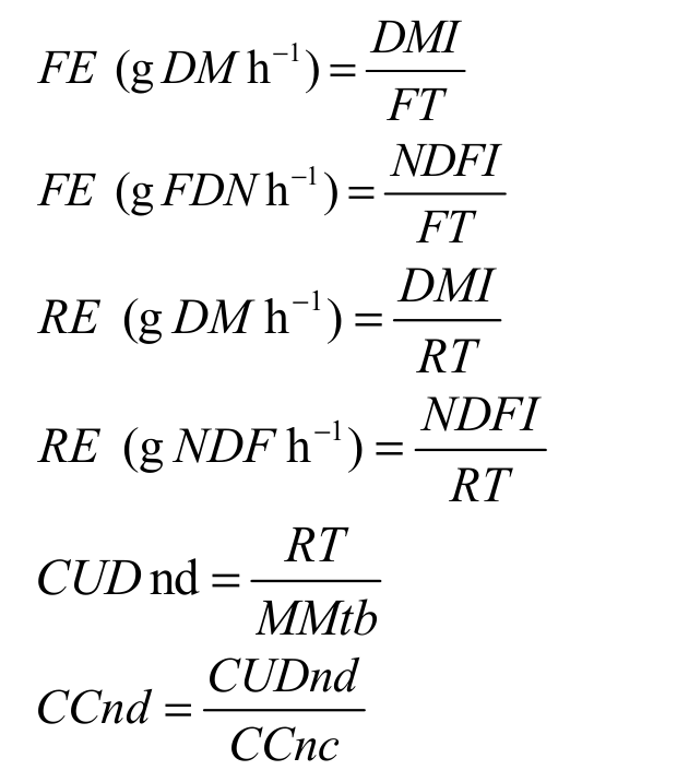 where: FE (g DM h-1, g NDF h-1) is the feeding efficiency; DMI (g DM day-1) is the dry matter intake; FT (h day-1) is the feeding time; RE (g DM h-1, g NDF h-1) is the rumination efficiency; RT (h day-1), rumination time; CUDnd (number day-1), number of cuds per day; CCtc (seconds cud-1), time spent in chewing per cud; CCnd, number of cud chews per day and CCnc (number cud-1) is the number of chews per cud (Polli, Restle, Senna, & Almeida, 1996). The experimental variables were subjected to analysis of variance and regression, using the GLM procedure of SAS (2004).