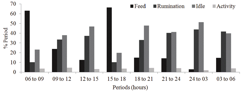 Other activities, which represent the activities of the animal that are not linked to intake, rumination and idle, were not affected by period of the day, with a mean value of 3.7% of the total time within 24 hours, representing the time used in other activities.