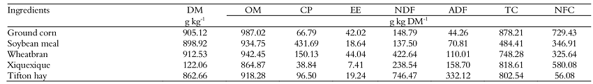 During the experiment, the diets were supplied as a complete mixture in two meals, at 6 and 16 h, allowing 10% leftovers. Daily, in the collection period, the samples of food and leftovers were collected in the morning, weighed, stored and frozen for later processing. At the end of the collection period, the samples were thawed and homogenized for making composite samples per animal/period. Subsequently, all samples were pre-dried in a forced air oven, ground through a 1 mm sieve, and subjected to chemical analysis at the Animal Nutrition Laboratory, Department of Animal Science, Federal University of Ceará.