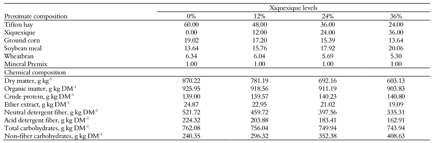 The treatments consisted of increasing proportions of replacement of Tifton grass hay with xiquexique (0, 12, 24 and 36%) in the total feed, maintaining forage: concentrate ratio of 60:40, on a dry matter (DM) basis. Xiquexique was collected and transported from the caatinga; the thorns were burned with a flamethrower gas for subsequent grinding in a shredding machine. The Tifton grass hay was purchased at Laranjeira Farm, in Assu, state of Rio Grande do Norte, the grass was cut when about 50 days of age.