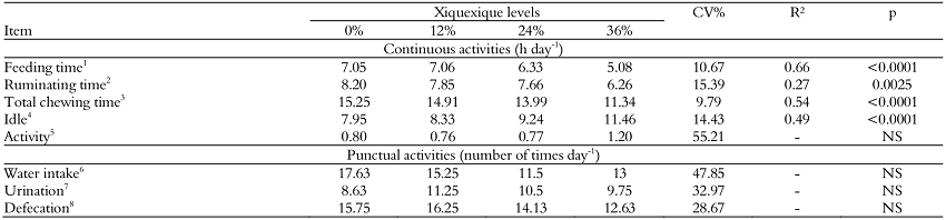 There was a linear increase in idle time with the rise of xiquexique levels in the diet, with estimated values of 7.5 and 11.1 h-1 day-1 for levels 0 and 36% replacement, respectively. By means of the regression equation, it was found that for each percentage point of xiquexique added, the idle time increased 0.10 h-1 day-1. This is related to the reductions in the FT and RT, caused by the reduction in NDF content with increasing xiquexique levels that favored the increase of idle time. Similarly, Bürger et al. (2000), working with dairy cows fed different sources of forage, registered shorter times spent in feeding and ruminating and longer idle time in the diets with lower content and intake of NDF. The time spent in other activities was not influenced by experimental diets, with mean values of 0.88 h-1 day-1.