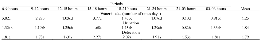 Urination was also altered by the time of the day, with peak in the period of 15-18 hours and lower frequency at 24-3 hours, and the other periods showed intermediate values. Defecation was not affected by the periods of the day, with a mean value of 1.79 times period-1.