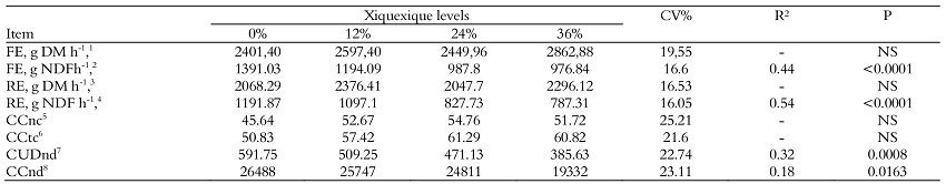 The FE and RE, expressed in g NDF h-1, showed a linear decrease according to the levels of xiquexique in the diets. Each percentage unit of xiquexique added to the diet reduced the FE and RE in 12.1 and 12.4 g NDF h-1, respectively. This result is due to lower amount of NDF in diets with higher levels of xiquexique and therefore lower content of physically effective NDF (NDFpe). According to Carvalho et al. (2008), reductions in NDFpe content of the feed promote decrease in time spent chewing (feeding and rumination).