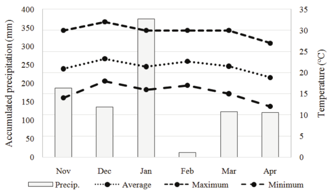 The experiment was conducted in São João Del-Rei, MG, Brazil (21º 08’ 11’’ Sand 44º 15’ 43’’ W, 904 m asl). The climate of the region, according to the Köppen (1948) classification, is a Cwa type, with well-defined dry (May to October) and rainy (November to April) seasons. During the experimental period (November 2012 to April 2013), minimum, average, and maximum temperatures and precipitation were measured (Figure 1) from a meteorological station approximately 350 m from the experimental area.