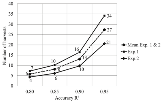 Values of R2 were high in magnitude, ranging from 0.81 to 0.90 in Exp. 1, and from 0.91 to 0.95 in Exp. 2, suggesting the number of harvests was enough to provide high accuracy in selecting genotypes. However, 12 and 16 harvests may not be feasible in practice, since high number of harvests is time-consuming and it would lead to high costs. In this study, the high number of harvests as well as the high R2 estimates may allow for a more robust estimation of the minimum number of harvests, at similar accuracy levels, than those with much lower number of harvests and lower R2.