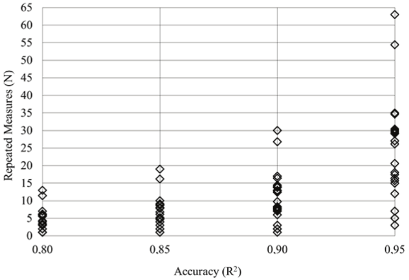 Martuscello et al., 2015, Torres et al., 2016, and Exp. 1 and Exp. 2 from this study) resulted in different estimates of the number of repeated measures for DMY (Figure 2). Since the estimates are likely an integration of many factors, the definition of a range considering the outcome of many studies may be more robust than a specific number of repeated measures estimated for individual studies. For the above experiments, there is a cluster of estimates ranging from 4 to 7 at 0.80 accuracy and 5 to 9 at 0.85 accuracy (Figure 2). Thus, the expected range of harvests for DMY in P. maximum would likely be within those ranges. The environmental span variability affecting the experiments would direct the decision to lower or higher number of harvests. Some similar estimates of repeated measures are also reported for DMY of other forages such as elephant-grass (Pennisetum purpureum Schum., Shimoya, Pereira, Depaula, Damião, & Souza, 2002) and alfalfa (Medicago sativa L., Souza-Sobrinho et al., 2004).