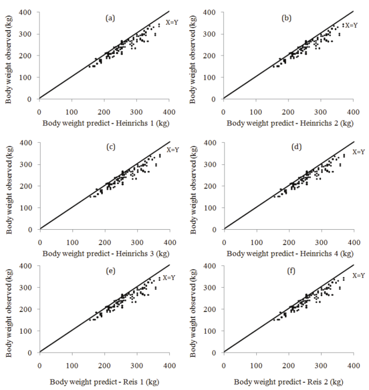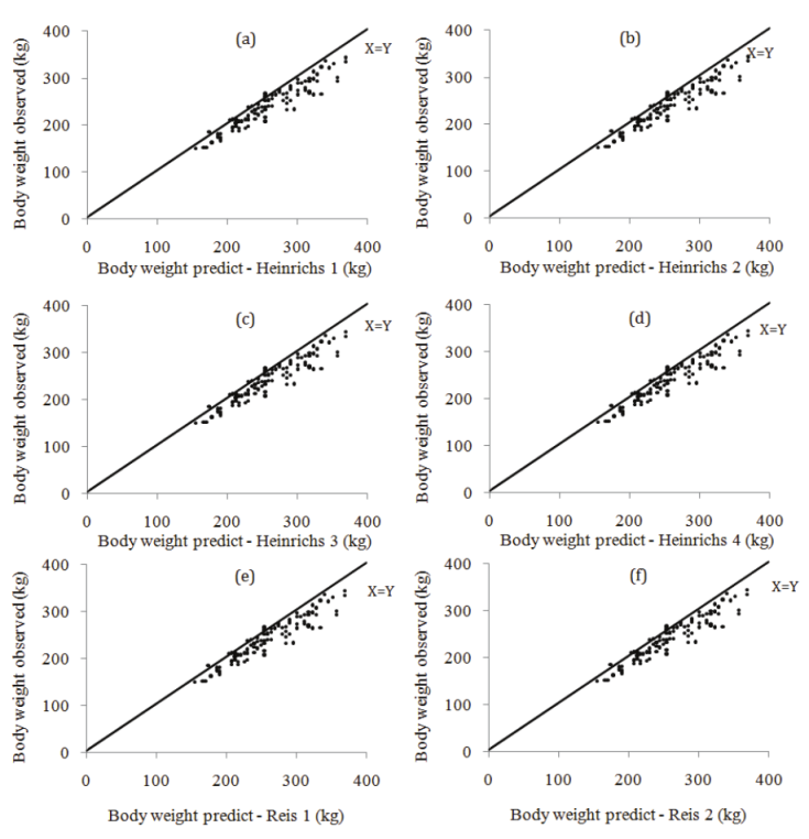 found for Equations 1, 5 and 6 (Figures 2a, 2e and 2f, respectively). In growing crossbred heifers, a higher bias in prediction was the main factor affecting the quality of BW prediction Equations by Heinrichs et al. (1992). Equations 1, 5 and 6 had the lowest dispersion, likely explained by the fact that HG was used as the body measure, which has the greater correlation with BW. Caution should be exercised when using Equations developed for Holstein animals in crossbred animals, as they can be associated with high prediction errors.
