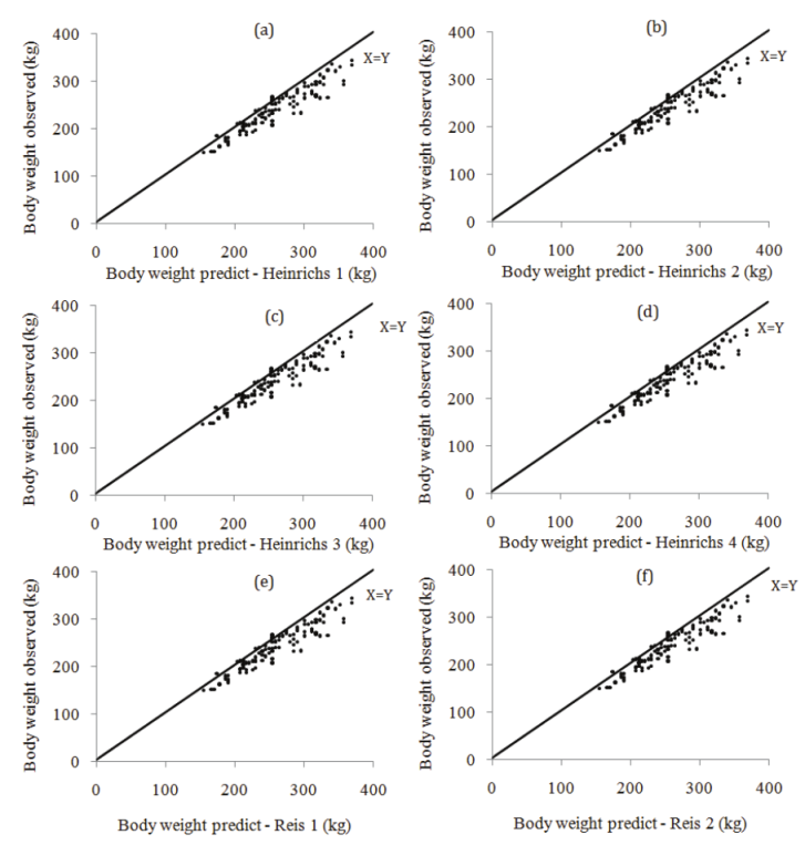 The joint evaluation of the intercept and slope coefficient in the regression Equation for observed versus predicted values for BW (Table 3) in Holstein heifers also rejects the null hypothesis (p < 0.05) for all Equations. This also indicated that evaluated Equations are inadequate for predicting BW in growing Holstein dairy heifers.