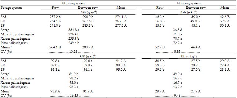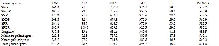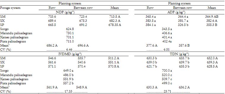 For the IVDMD, the values were not similar (p > 0.05) between the intercropping systems in the two planting systems. However, when comparing forage systems, sorghum silage in monocrop showed higher IVDMD compared to monocrops of the cultivars of Urochloa brizantha. This result may be due to the presence of grains in the sorghum crop.