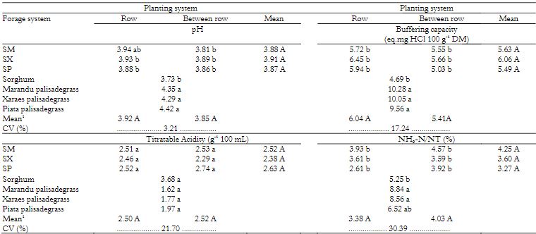 Considering the pH, the lowest values were in sorghum in monocropping and in intercropping systems, demonstrating the importance of crop-livestock integration system, in order to contribute to reduce the pH value in silages. Possibly this is due to high content of soluble sugars in sorghum, readily available for fermentation of lactic acid-producing bacteria.