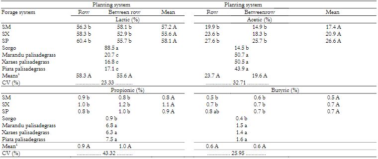 The concentration of lactic acid was higher (p < 0.05) in silage of sorghum in monocropping, followed by the silages of intercropping systems (Table 3). It is noteworthy that the silages in intercropping systems produced about three times more lactic acid when compared to silages of Urochloa brizantha cultivars in monocrop. These results demonstrate the relevance of intercropping sorghum with Urochloa brizantha cultivars in the production of lactic acid, which plays a key role in the conservation of forage, for presenting a higher dissociation constant, being responsible for the pH drop to values below 4.2 (Moisio & Heikonem, 1994).