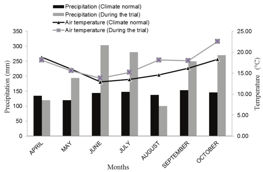 The trial was performed from April to October 2014 at the Federal University of Santa Maria (UFSM), Santa Maria - RS, Brazil, located in the central depression of Rio Grande do Sul, latitude 29º43 'S and longitude 53º42' W. The soil is classified as sandy Dystrophic Red Argisol. According to the classification of Köppen, the climate is humid subtropical (Kuinchtner & Buriol, 2001). The temperature and precipitation averages during the trial were 17.34°C and 194.28 mm, higher than the climate normals for the region (15.76 and 140.51 mm - Figure 1).