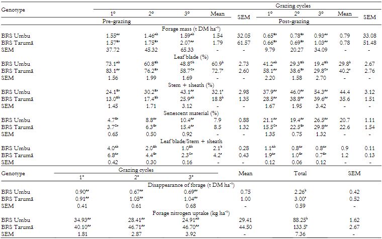The forage mass in the pre-grazing for BRS Tarumã genotype was higher than BRS Umbu only in the second grazing cycle (Table 1). This difference was attributed to the higher leaf blade proportion during the trial period. Among grazing cycles, from the second to the third cycle, an increase in forage available was verified only for BRS Umbu genotype due to the higher stem + sheath proportion in this period.