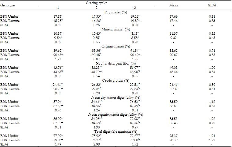 For the percentages of dry matter (DM), there was no difference between genotypes (Table 2). Among grazing cycles, there was an increase in DM content in the third cycle for BRS Tarumã, a condition attributed to the increase in senescent material (Table 1). For mineral matter (MM) and organic matter (OM), similarity was found between both genotypes and grazing cycles, with percentages close to 10 and 90% for MM and OM, respectively.