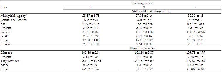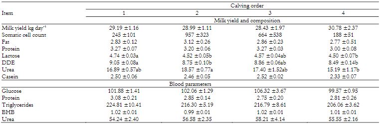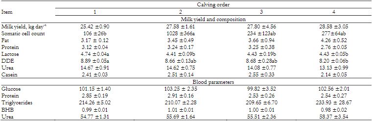 One hundred ten Holstein cows were housed in the same pen, with adaptation period of 7 days before collection. The animals were grouped according to calving order (first, second, third, and fourth calving) at different days in milk (DIM): early (1-90 DIM), middle (91-180 DIM), and end of lactation (over 181 DIM) for comparing milk yield, milk composition, and blood metabolic profile between the calving orders within the same lactation period.