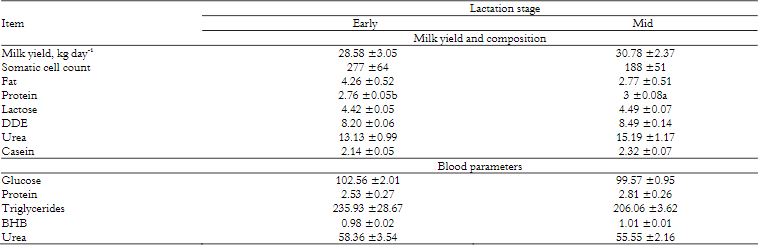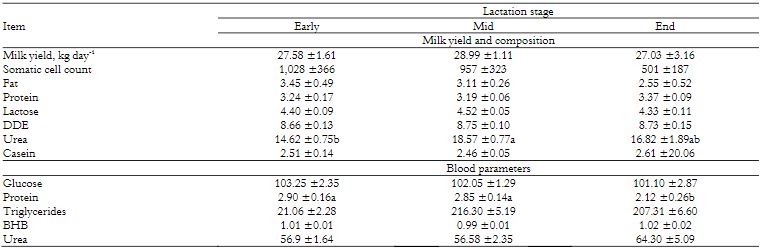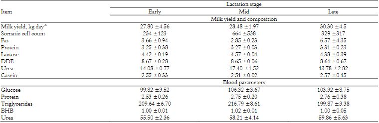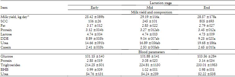 Primiparous cows in the middle and end of lactation showed greater milk yield compared to early lactation cows (Table 4).