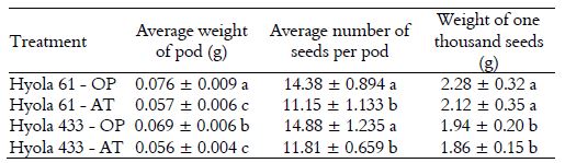 There was a significant difference between the treatments for hybrids in relation to the mean weight of the pod. Hyola 61 presented a heavier pod, showing that it responded better to pollination, and was more affected by OP than Hyola 433. In the AT treatment, there were no significant differences (Hyola 61: AT = 0.057 ± 0.006 and Hyola 433: AT = 0.056 ± 0.004).