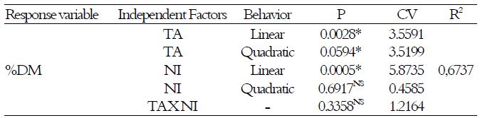 Data of the statistical analysis, p-value, coefficient of variation (CV) and coefficient of determination (R2) obtained for the DM content are listed in Table 1.