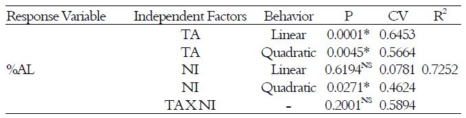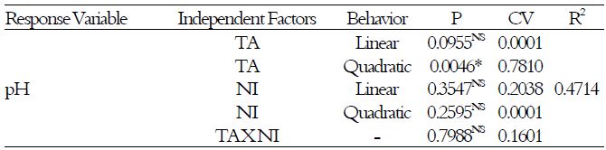 The linear factor of TA, as well as the factors of NI and the interaction between TA and NI do not affect the behavior of pH, at 5% of significance. However, according to Van Soest (1994), during the fermentation process that takes place inside the silos, there is organic acid production, which is also responsible for the reduction in pH values. Therefore, the acceptance of the hypothesis H0 for the linear factor of TA can cause the Type II error. Thus, the linear factor of TA was considered in the equation that describes the behavior of pH values (Equation 2).