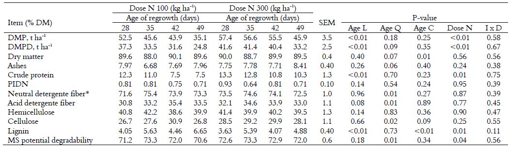 The contents of NDFap (p = 0.01), the ADF (p = 0.01), cellulose (p = 0.02) and the degradability of DM (p = 0.01) showed quadratic regression behavior with the advancement of age of regrowth. The same variables were not influenced by nitrogen fertilization (p > 0.05), presenting mean values of 72.3, 32.9 and 72.2%, respectively. The lignin content increased 50.1% with regrowth age (p < 0.01) and decreased 15.5% when the dose of 100 kg ha-1 of (5.2%) was increased to 300 kg ha-1 (p = 0.01).