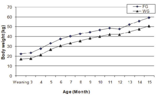 Figure 1 illustrates the changes in body weights of the females used in the current study from 3 to 15 months of age indicating that the growth rate of the females in the FG was better than in the WG group.