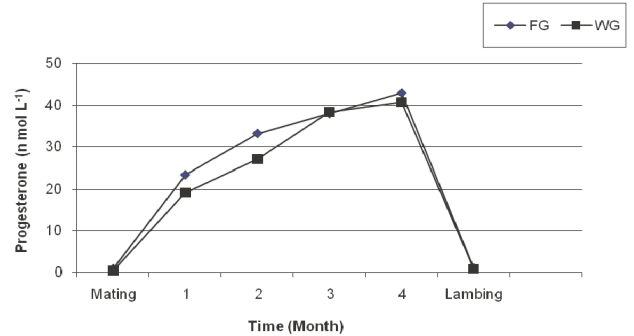 At mating, progesterone concentration was very low (below 1 nmol L-1.), and due to the activity of the corpus luteum during pregnancy, progesterone concentrations rose from basal levels and remained elevated throughout pregnancy, but declined sharply after lambing (Figure 2). Similar results were reported by Zarkawi (2011) in female Syrian Awassi sheep.