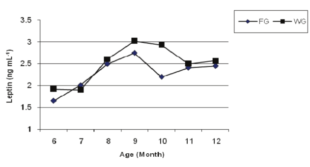 Leptin concentrations did not change pre, during or post puberty in both groups (Figure 3). However, individual variations were reported in leptin concentration ranging from 1.02 to 4.47 ng mL-1. Average leptin concentration was 2.50 ± 0.84 ng mL-1, and 2.43 ± 0.83 and 2.57 ± 0.85 ng mL-1 for FG and WG groups, respectively with no difference among the groups, and the overall average concentration was 2.50 ± 0.84 ng mL-1.