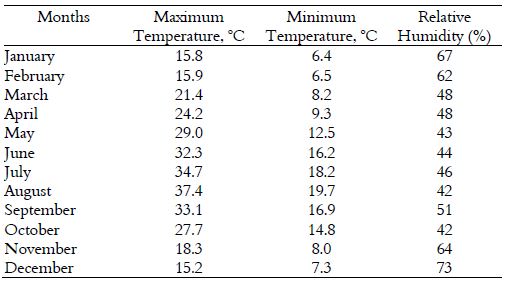 This study was performed in the Scientific Agricultural Research Centre, General Commission for Scientific Agricultural Research. The centre is located about 5 km west of Salamiah city (240 km north east of Damascus), with an average annual rainfall of approximately 250 mm. Average monthly maximum and minimum temperature, as well as the relative humidity throughout the year is illustrated in Table 1.