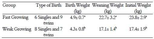 Thirty Syrian Awassi ewe lambs, aged around 3 months were used. Lambs were equally divided according to their birth and weaning weights in 2 groups, fast growing (FG) and weak growing (WG) lambs. Lambs were weaned at about two months age. Birth dates of lambs were almost similar (19 November to 04 December), and the characterizations of the ewe lambs used in the study are summarised in Table 2.