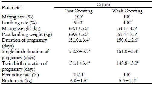 Overall average mating and post lambing weights was 58.3 ± 6.2 and 65.9 ± 8.3 kg, respectively. There were differences among the females in both groups in terms of mating and post lambing weights (61.5 ± 5.3 and 70.6 ± 6.4 kg, and 54.1 ± 4.3 and 61.5 ±7.4 kg, for FG and WG groups, respectively. These weights are higher than those reported by Lassoued and Rekik (2001) in Queue Fine del'Ouest and Queue Fine del'Ouestx x D'Man breeds averaging 45.7 and 40.5, respectively.