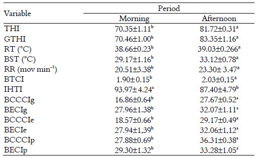Differences (p < 0.05) were found for THI and GTHI between the periods of the day, with higher means in the afternoon (Table 1). The significant differences of THI and GTHI between the periods of the day suggest that the animals are experiencing thermal stress given that the thermal condition well above the comfort zone of up to 70 for THI and up to 74 for GTHI (Souza et al., 2007).