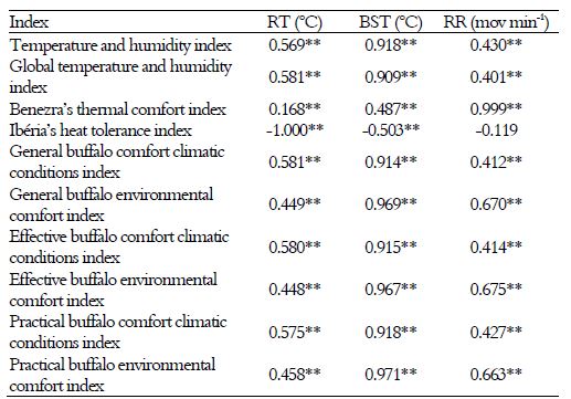 The correlations found among the tested indices and the physiological variables allowed the efficiency of these formulas to be assessed so that the actual thermal comfort conditions of the buffaloes reared in the Eastern Brazilian Amazon could be determined. According to Silva, Morais, & Guilhermino (2007), the correlations between the indices and the physiological variables are an indication of the efficiency of each index and reflect the animals’ response to the environment.
