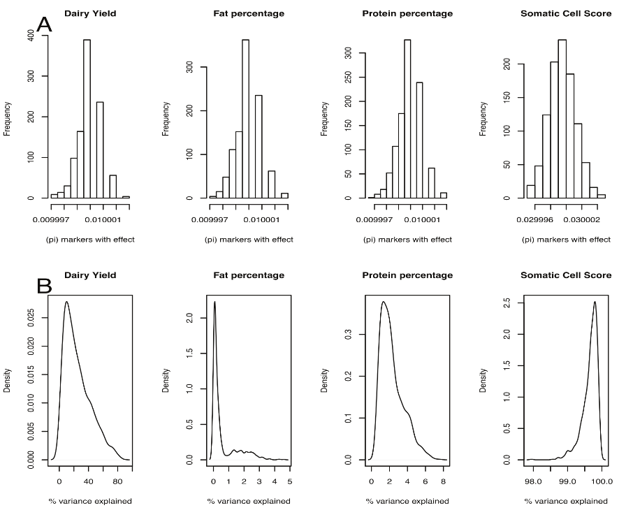 It is clear that the genetic architecture differs between the quantitative traits of importance for the dairy industry (Hayes et al., 2010). However, for some traits a large proportion of the genetic variance is associated with genomic regions with very small effect variants, and only a few traits present variants of great effect on a phenotypic characteristic and explain large proportion of the genetic variance (Dekkers, 2012). According to the genetic architecture, features which are governed by a greater number of QTLs, are less likely to identify false positives using the methodology Bayes C. In the same way the power of the test increases with heritability (Van den Berg et al., 2013).