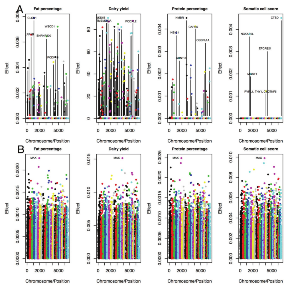 For example, in the BTA-6 for fat percentage (Figure 2B), it can be observed a sharp peak which is much lower when ( = 0.01 (Figure 2A) but corresponding to the same marker at the top. Moreover, it is interesting to note that by including all markers, a peak on chromosome 14 is evidenced for fat percentage, which although is not the largest, is important because it corresponds to DGAT1 gene, which has been proposed repeatedly as a major gene for fat content in milk (Grisart et al., 2002; Wang et al., 2012). However, this peak is not observed when ( = 0.01, possibly because there are some markers with greater effect. Finally, it should be noted that the estimation with a markers fraction allowed to explain a greater proportion of the variance in some cases and was therefore used in this work.