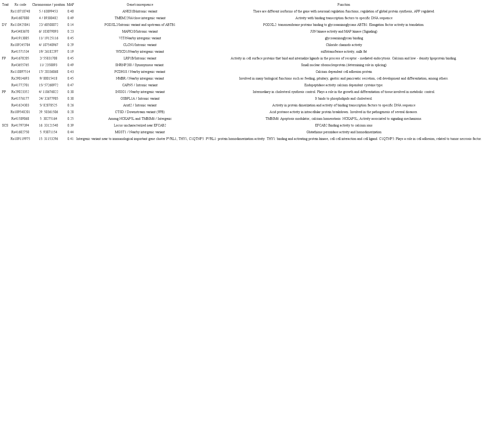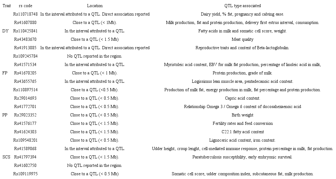Given the above, the objective of this work was to contribute to the understanding of the genetic variance explained by multiple SNP of the BovineLD Bead Chip (Illumina, San Diego CA), using GWAS with Bayes C( approach, in order to identify also polymorphisms associated with Dairy Yield (DY, h2 = 0.16), Fat Percentage (FP, h2 = 0.32), Protein Percentage (PP,h 2 = 0.30), and Somatic Cell Score (SCS, h2 = 0.01) which genetic parameters were previously estimated (Rincón, Zambrano, & Echeverri, 2015).
