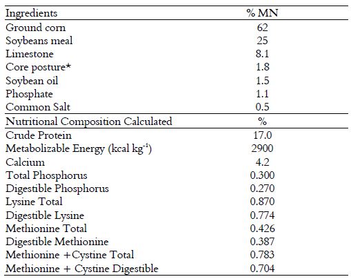 Both treatments received the same feed and the formulation was calculated from the requirement for commercial laying hens presented by Rostagno et al. (2011) in the Brazilian Tables for Poultry and Swine (Table 1).
