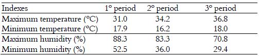There were high temperatures during the experimental period evaluated (June to August), the maximum observed was 36.8°C and the minimum was 16.2°C and a reduction in humidity, both maximum and minimum, 88.3 and 52.5% respectively (Table 2).