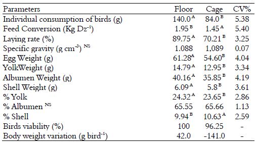 In relation to egg quality, it is noticed that the egg weight on the floor and in cages were 61.28 and 54.60g, respectively. As for the weight of the other egg components, yolk, albumen and shell, they also differed statistically (p < 0.05). On the floor, they presented higher values than in cages, considering the negative effects of the thermal discomfort imposed to the birds housed in cages.