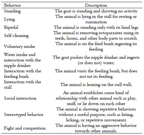 During the pre-experimental period, the activities performed by the animals were recorded for one hour. Trained personnel recorded the behavior of each animal. All people responsible for recording animal behaviors were trained in order to increase the observations accuracy. Goat behaviors were observed for two hours during 10 days from 10:00 to 11:00 and from 16:00 to 17:00, using 10-minute intervals. This timing was chosen because the animals had already consumed their feeding and rumination rate had already decreased. The behaviors were recorded using focal-animal sampling method. Each animal was observed during 10-minute period, resulting in 6 observations per hour, 12 observations per day, and 120 observations per animal during the experimental period.