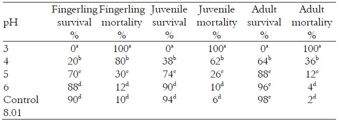 In pH 4 tanks, 40, 62 and 36% mortalities of the fingerlings, juveniles and adults were recorded (Table 1). In the pH 5 tanks, 30% mortality of the fingerlings were observed, while 26% mortality of the juveniles and 12% mortality of the adults were recorded (Table 1). In pH 6 tanks, 12% mortality of the fingerlings were recorded, with 10% and 4% mortalities of the juveniles and adults were observed (Table 1).