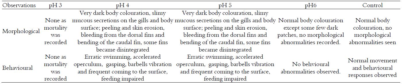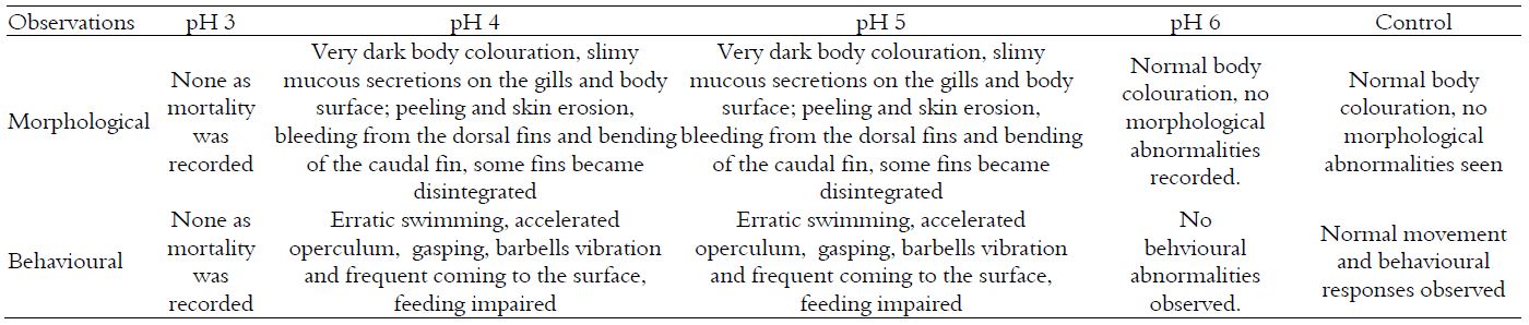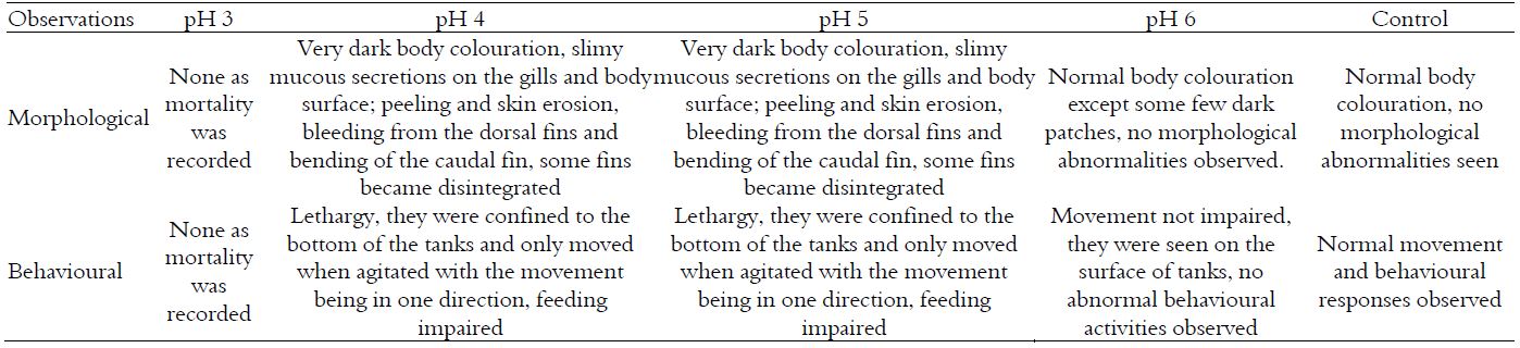 Morphological and behavioural changes observed in the fish include erratic swimming among juveniles and adults in especially in pHs 4 and 5, accelerated operculum movement leading to gasping, barbells vibration and frequent coming to the surface. Very dark body colouration and slimy mucous secretions were observed on the gills and body surface; peeling and skin erosion were also noted. There was bleeding from the dorsal fins and bending of the caudal fin, some fins became disintegrated and impairment in feeding was observed. In pH 4 and 5 tanks, fingerlings were lethargic, confined to the bottom of the tanks and only moved when agitated with the movement being in one direction. Feeding was observed to be reduced with uneaten food in the tanks (Tables 2, 3 and 4).