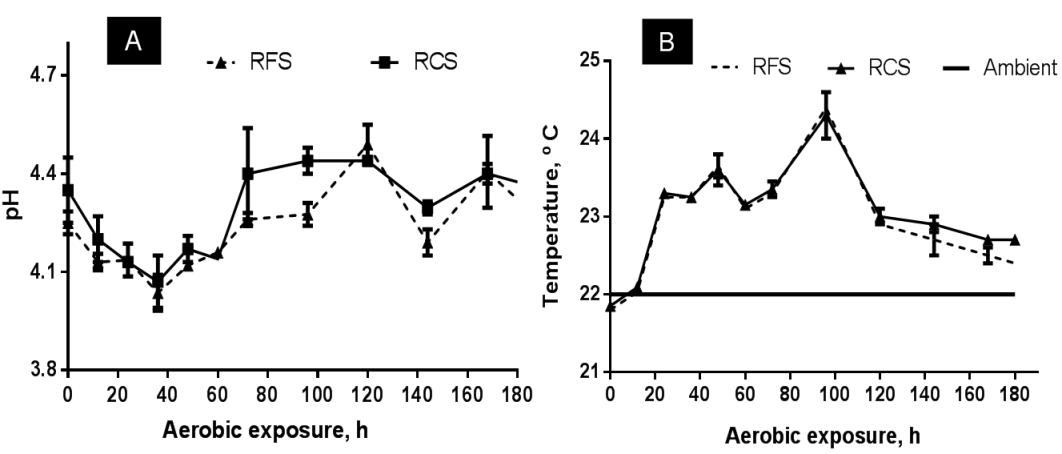 The average pH values were different (p < 0.02) during the aerobic exposure phase. The RFS had lower pH (4.25) compared to RCS (4.38), probably because the level of the acetic and lactic acids was higher in RFS (Table 3).