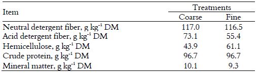 It is assumed that processing in 2 mm sieve theoretically increased starch availability to microorganisms, especially lactic acid bacteria (LAB). Therefore, the concentration of organic acids increased and allowed proteolysis of hydrophobic proteins (zeins), thus increasing the fermentability of starch present in the endosperm. Lower NDF and ADF values in rehydrated corn silage with lower particle size were not associated with an acidic hydrolytic activity on the hemicellulose, according to the theory of McDonald (1981), since ADF decreased in both treatments. Rezende et al. (2014) evaluated the effect of adding water or whey during corn rehydration process and reported that the moisture content influenced both variables, NDF and ADF. Further, Rezende et al. (2014) evaluated the composition of corn grain silage with inoculant and reported values of 231 and 439 g kg-1 DM for NDF and ADF, respectively. These values are higher than those values observed in this study.