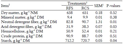 The variables dry matter (DM), crude protein (CP), and mineral matter (MM) were not different (p > 0.05) among treatments (Table 2). On the other hand, the starch content differed among treatments with 712.2 and 720.7 g kg-1 for RFS and RCS, respectively. The lower starch content (g kg-1 DM) of RFS possibly resulted from physical and chemical changes during the fermentation process.