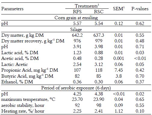 The lactic acid concentration was different (p < 0.03) between silages, with values of 1.23% and 0.88% DM for RFS and RCS, respectively. Similarly, acetic acid concentrations were also different (p < 0.01) with higher values for RFS (0.48% DM) compared to RCS (0.28% DM). The production of acetic acid (71%) was higher for RFS. The production of the main organic acids is affected by the ensiling process used, maturity and corn grain composition, moisture at the time of ensiling and the epiphytic population of microorganisms (Lopes, Biaggionni, Berto, Sartori, & Boff, 2005; Muck et al., 2003; Weinberg & Ashbell, 2003).