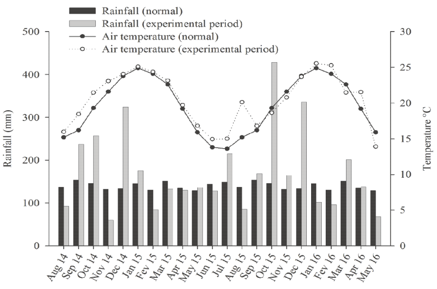 The research was conducted at the Dairy Livestock Sector, Department of Animal Science of the Federal University of Santa Maria (UFSM), located in the Central Depression of the State of Rio Grande do Sul, during two crop years, from August 2014 to May 2016. The climate of the region is humid subtropical (Cfa), according to Köppen classification; the climatological normals (Figure 1) of temperature is 19.2ºC and rainfall is 140.5 mm month-1. For the experimental period, the values of monthly average temperature and rainfall were 20.5ºC and 170.9 mm month-1 (Instituto Nacional de Meteorologia [INMET], 2016). During this period, 16 frosts were recorded at the UFSM Weather Station, located approximately 700 m from the experimental area, six in August 2014, seven in June 2015, one in July 2015 and two in September 2015.
