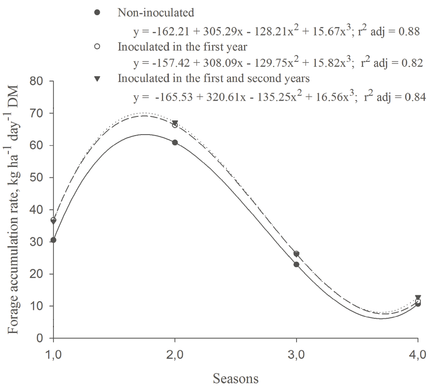 Observing the plot of the curves representing the pastures under inoculation, it was observed that there is similarity, demonstrating, therefore, that there is no need to reinoculate the pasture. The daily accumulation rate recorded in the summer for inoculated pastures, of 66.8 kg ha-1 DM, is similar to that obtained by Anjos et al. (2016) in the same season, of 67.8 kg ha-1 DM, evaluating Coastcross-1, fertilized with 200 kg ha-1 year-1 N and grazed by dairy cattle.